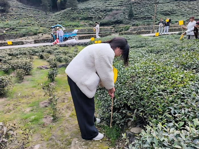 活动以“党建引领、科技兴农”为目标,旨在发挥学生党员的专业知识与实践能力,推动现代农业技术落地乡村。在岭脚村田间,岭脚村党支部书记程永峰和柳丽平老师首先向同学们讲解了黏虫黄板的生态防虫原理及使用方法。随后,同学们分为四组,与村民协作完成黄板插种工作,覆盖茶园及蔬菜种植区多亩地。过程中,学生党员和积极分子们认真做好自己的本职工作,旨在专心帮助当地农民,助力农民的茶园更好的生长。