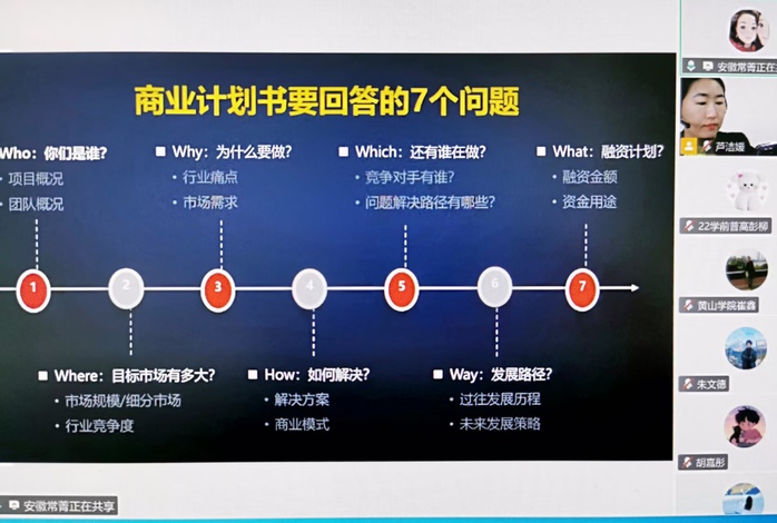 围绕参赛核心环节——商业计划书撰写,常菁结合多年评审经验,提炼出商业计划书撰写所要解决的“七个问题”。她通过往届获奖案例拆解,详细剖析了项目选题、市场分析、商业模式设计、财务规划等模块的撰写技巧,并特别提醒学生避免“技术堆砌”和“空想式创新”,应注重用户调研与可行性验证。此外,她还分享了PPT制作、路演答辩的实用技巧,强调“用故事打动评委,用数据说服市场”。