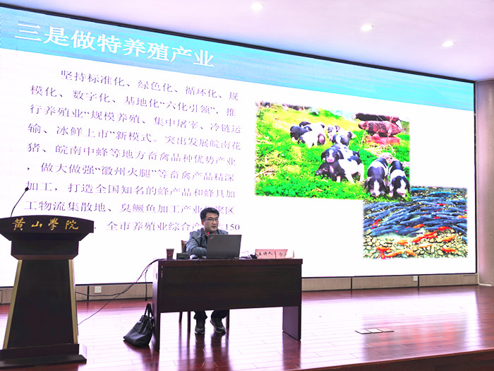 4月27日下午,校团委组织开展的第九期听松乡土说暨大学生赋能乡村振兴系列讲座在文端楼第二报告厅开讲。黄山市农业农村局技术推广中心主任李永胜应邀作主题为“黄山乡村产业现状”专题讲座,我校200余名师生聆听讲座。