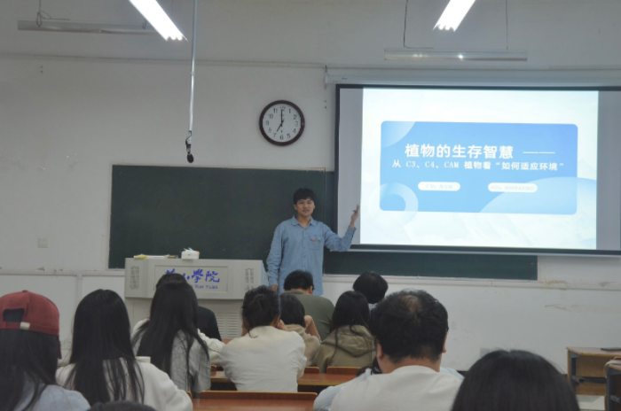 4月26日晚,文化与传播学院和生命与环境科学学院共同举办的《植物的生存智慧—从不同光合作用植物如何适应环境》科普讲座在文渊楼1108教室举办,生命与环境科学学院团委学生会主席殷方磊担任主讲。