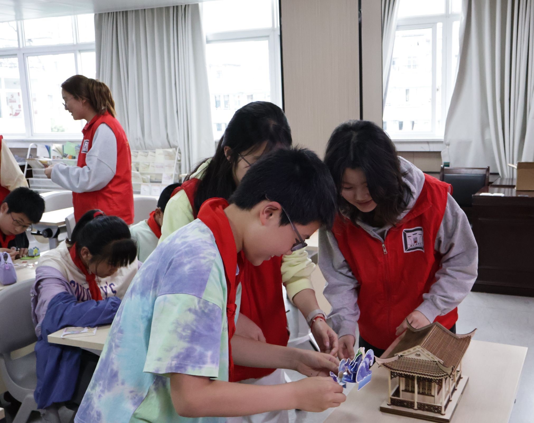 宣讲团以徽派建筑水玉轩模型,直观展现屋顶之美。在成员引导下,同学们观察飞檐、瓦当等细节,惊叹于构造与装饰的精巧。随后,宣讲团以平屋顶和四坡屋顶为例,组织绘画活动。活动高潮是拼屋顶模型环节,各小组分工协作,从选材到组装,攻克重重难题,当精巧的模型成型,大家满是自豪,亲手实践让同学们深入理解屋顶构造,更体会到徽派匠心精神。