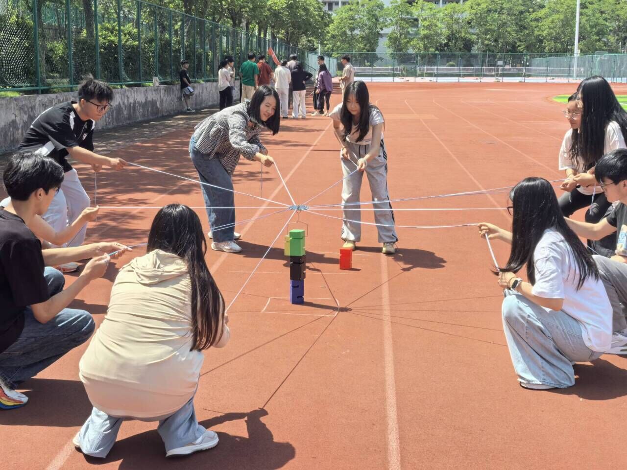 活动项目丰富,亮点十足。“一圈到底”中,同学们手拉手围成圈,传递呼啦圈,展现出绝佳默契,期间有人动作滑稽,引得众人捧腹大笑。板鞋竞速环节,大家脚穿板鞋,齐声喊着口号,步伐一致向前冲,彰显团结精神。投壶区域,同学们身姿优雅,专注投箭,投中时欢呼雀跃,场面热闹非凡。合力建塔考验团队协作,大家分工明确,小心翼翼搭建积木,力求搭建得又高又稳 。