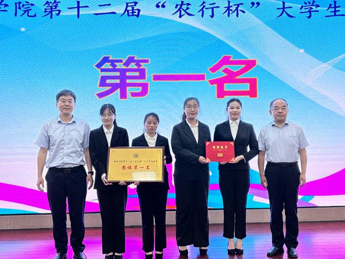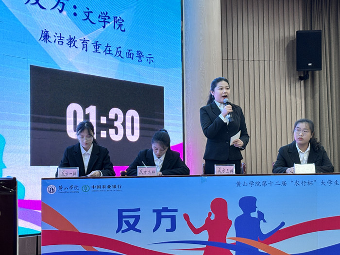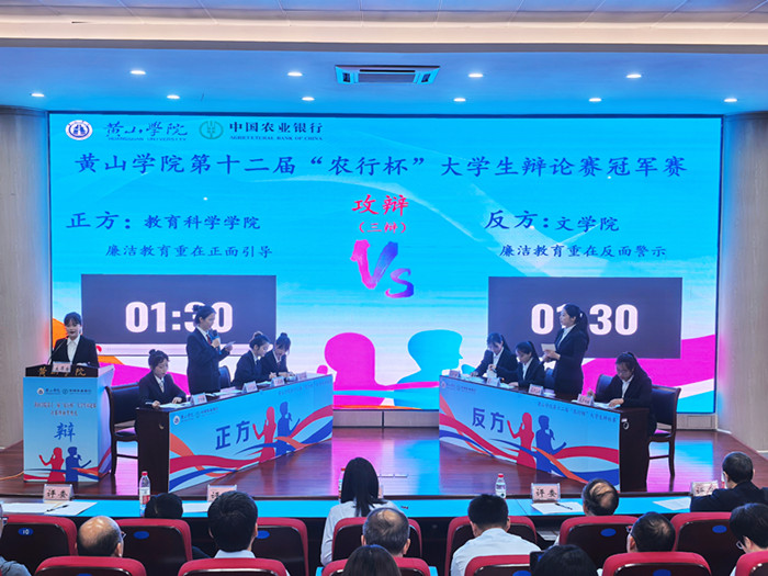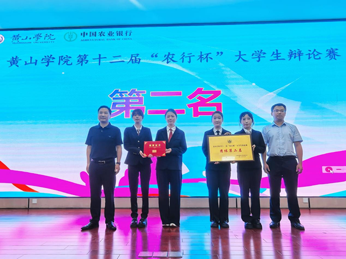5月28日下午,由博业体育(中国)官方网站-登录入口团委主办,中国农业银行黄山分行冠名赞助的博业体育(中国)官方网站-登录入口第十二届“农行杯”大学生辩论赛在率水校区文端楼第二报告厅圆满落幕。校党委委员、副院长张小明,中国农业银行黄山分行党委书记、行长陈辉,中国农业银行黄山分行机构业务部总经理汪振靖,中国农业银行黄山昱城支行党委书记、行长潘丽出席决赛现场并为获奖团队及个人颁奖。办公室、宣传部、人事处、财务处等部门负责人,旅游学院、文化与传播学院、教育科学学院、文学院等师生代表近300人观看了比赛。