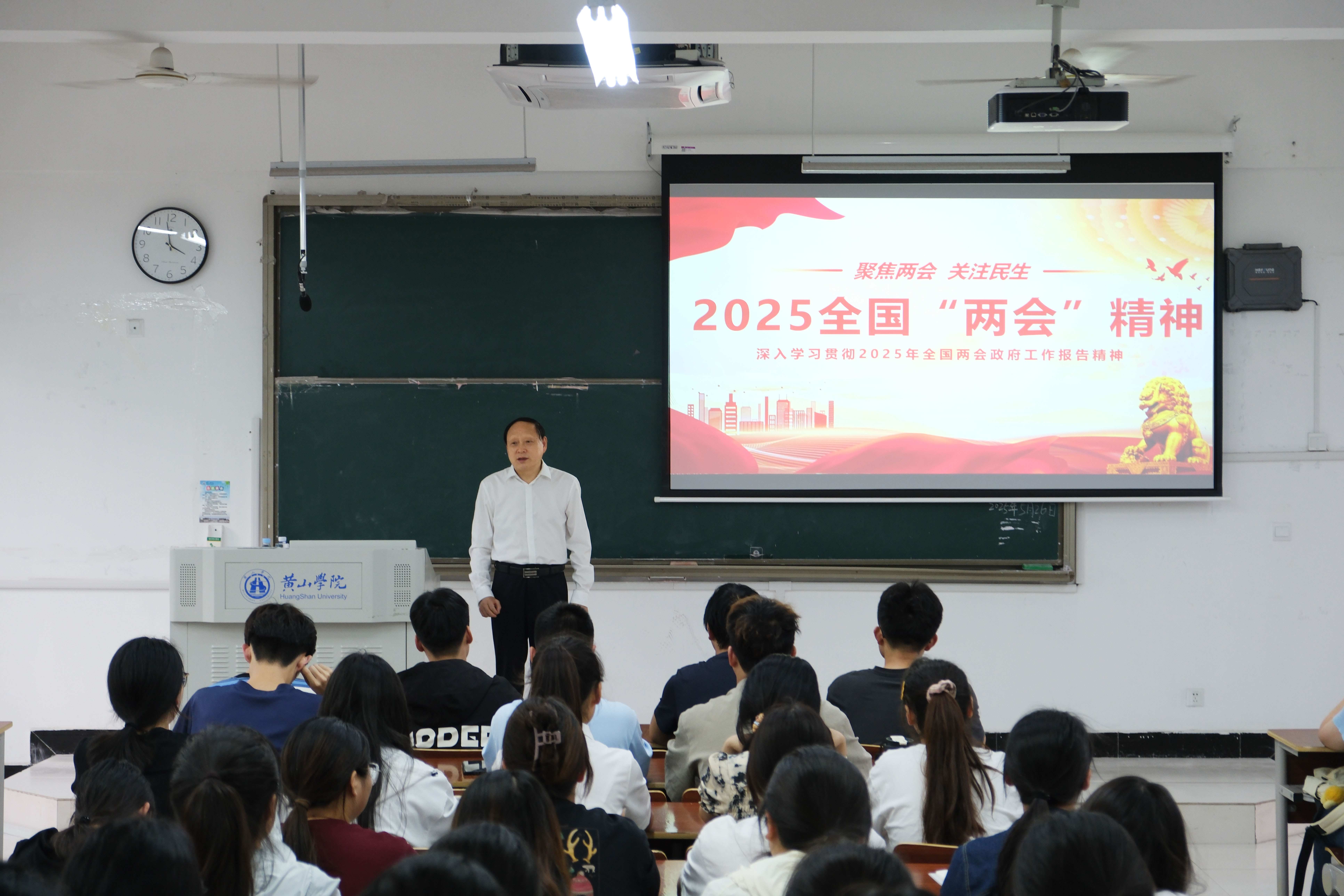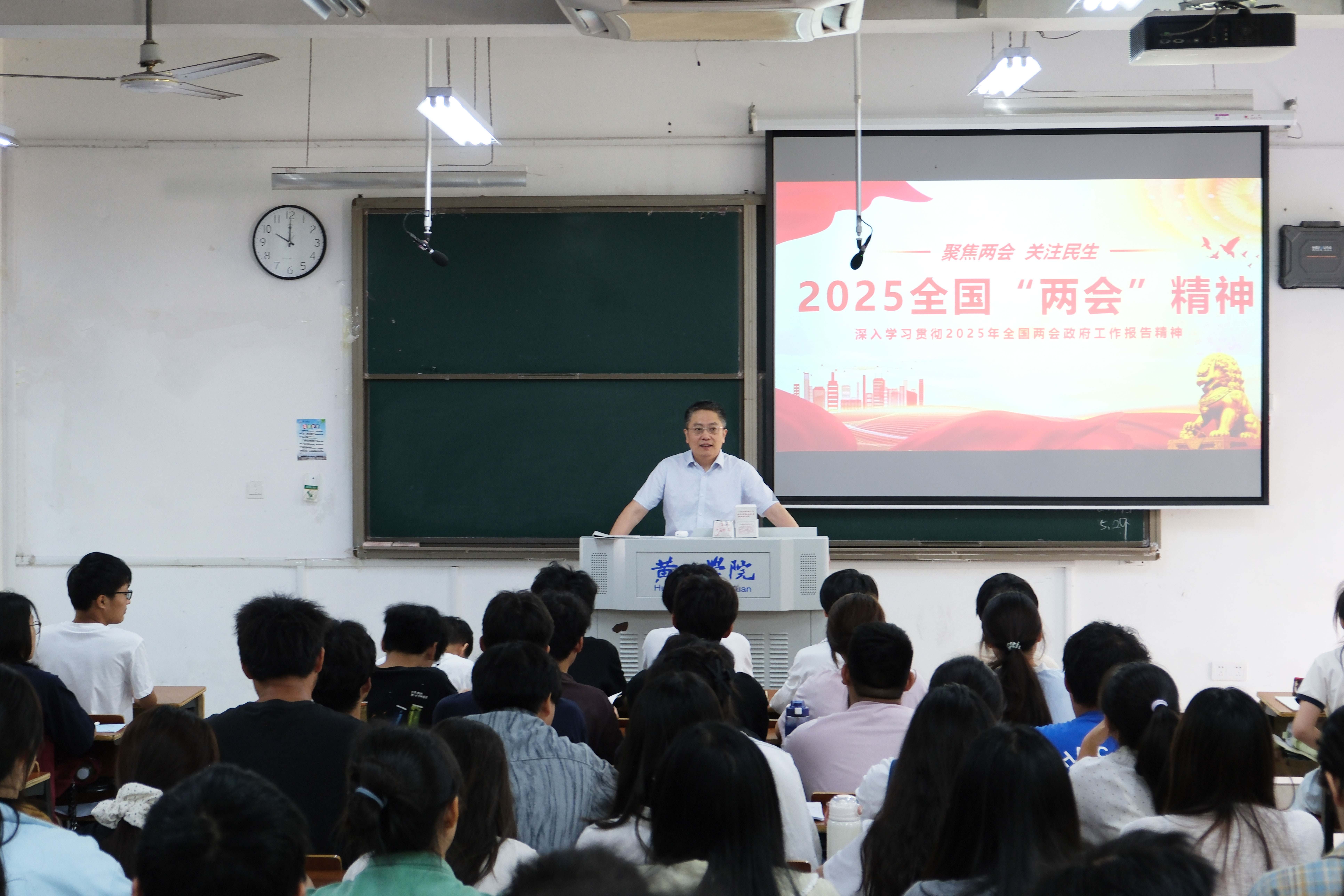 课堂上,校领导以“聚焦两会精神 勇担时代使命”为主题,系统解读了2025年全国两会的核心内容和重大意义,深入浅出地讲解了我国政治制度的运行机制,帮助学生夯实理论基础。在讲解2025年政府工作报告时,校领导重点分析了“新质生产力培育”“乡村振兴战略”“教育科技人才协同推进”等热点议题,并结合“95后”全国人大代表吉列子日返乡带领村民致富的感人事迹,生动诠释了新时代青年的责任担当。