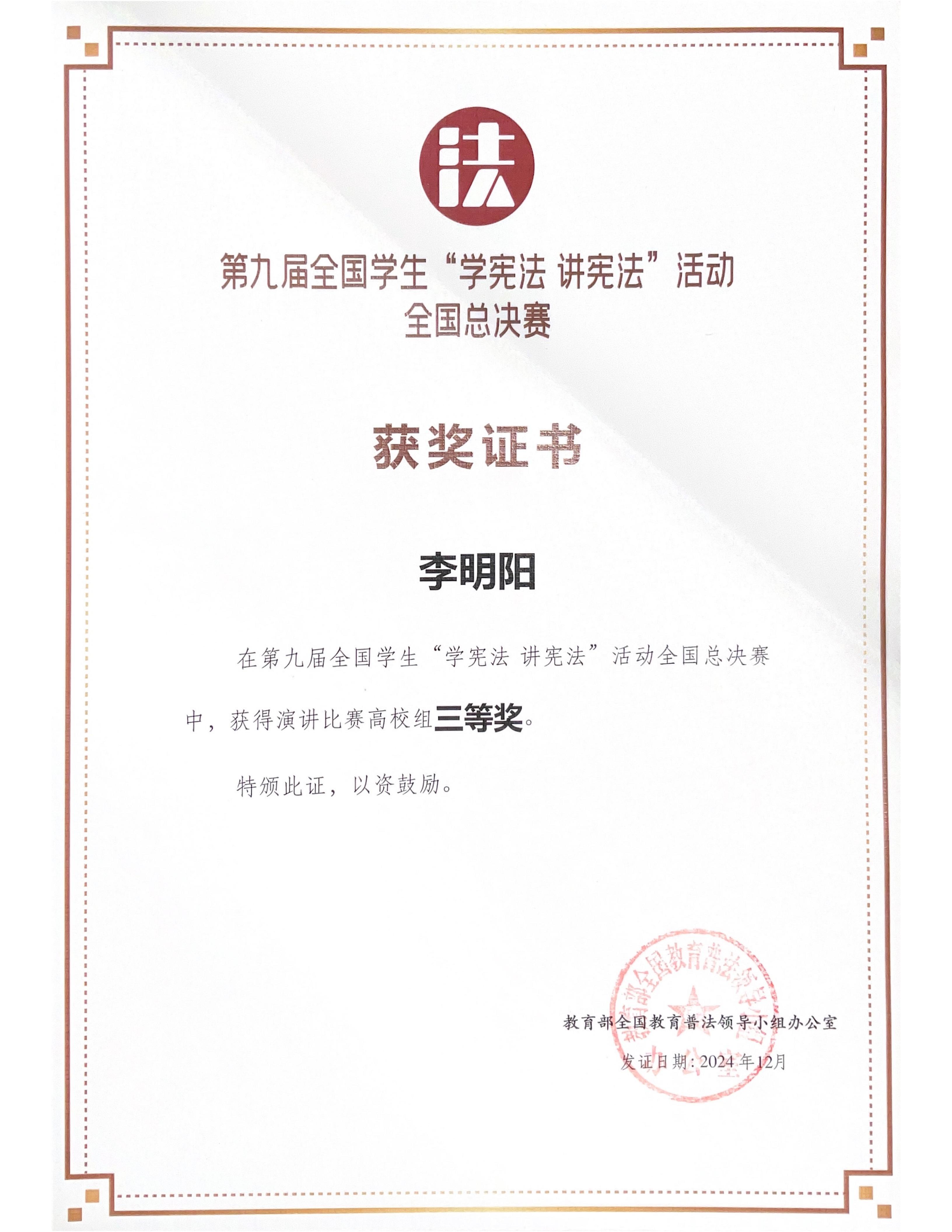 自那以后,他便如同一位勇敢的“闯关者”,在各类赛事中不断挑战自我。辩论场上,他凭借严密的逻辑和犀利的言辞,成为众人瞩目的“最佳辩手”;演讲台上,他用充满激情的话语,打动了无数评委和观众的心;主持人大赛中,他以扎实的专业功底,屡次斩获佳绩。在第九届全国学生“学宪法 讲宪法”活动中,他更是凭借出色的表现,先后拿下省赛一等奖和国赛三等奖的优异成绩。他热衷于在不同赛事中挑战自我,就像收集邮票般将各类奖项纳入成长的纪念册。“比赛对我来说是跳出舒适圈的契机,每一次站上舞台都是对专业的打磨,也让大学生活变得饱满而有张力。”谈及参赛动力时,李明阳眼中闪烁着明亮的光。