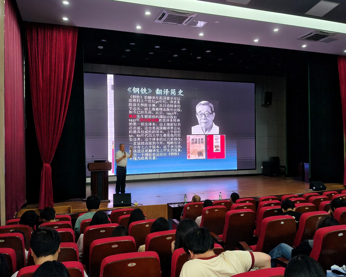 吴教授以《钢铁是怎样炼成的》中保尔·柯察金的形象为切入点,结合中国革命历史中"钢铁战士"的精神特质,提出红色经典翻译不仅是文字转换,更是构建中外精神共鸣的桥梁。他援引《红星照耀中国》《红岩》等经典译著,指出在向世界讲述中国革命故事时,译者需突破语言壁垒,在保留原著精神内核的同时,兼顾目标语读者的文化认知。吴教授还结合当下社会现实,探讨了“钢铁精神”在现代生活中的意义。他指出,在快节奏、高压力的现代社会,人们同样会面临各种挫折与挑战,如职场竞争、生活困境等,保尔·柯察金精神能为我们提供克服困难的动力。无论时代如何变迁,为梦想拼搏、在逆境中坚守的精神永不过时,鼓励大家将书中的精神融入日常生活,勇敢面对生活中的困难,实现个人价值与社会价值的统一。