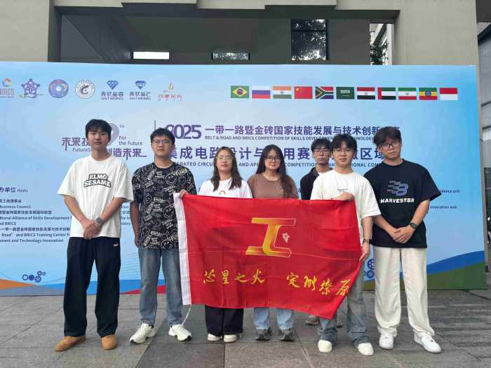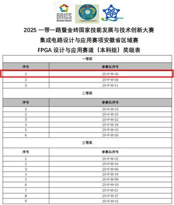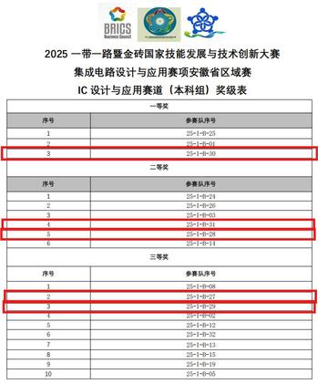 6月8日,2025一带一路暨金砖国家技能发展与技术创新大赛(以下简称“金砖大赛”)之集成电路设计与应用赛项安徽区域赛在安徽大学举行,我校信息工程学院学子荣获一等奖2项、二等奖2项、三等奖2项。
