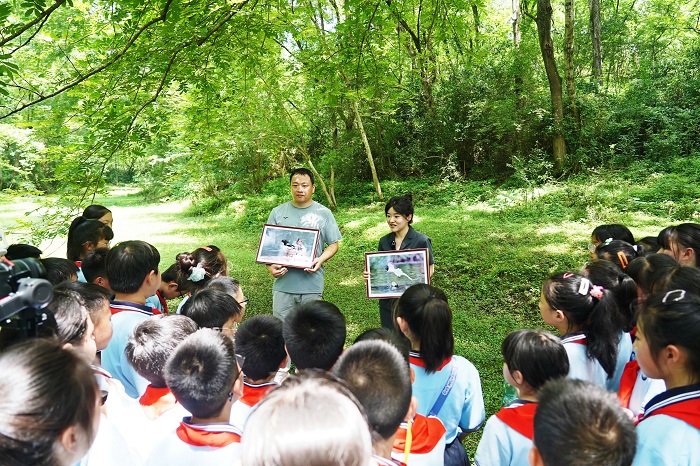 随后,生命与环境科学学院副教授于超博士带领孩子们深入基地,开启了一场寻找“林中仙子”寿带鸟的奇妙旅程。于超以生动的现场教学,引导孩子们凝神辨识寿带鸟的独特鸣唱,深入浅出地讲解其生态习性、濒危现状及国家二级保护动物的身份,将课堂延伸至绿水青山之间。学生们在真实的自然课堂中,深刻体悟到我院长期倡导的“尊重自然、顺应自然、保护自然”生态理念。