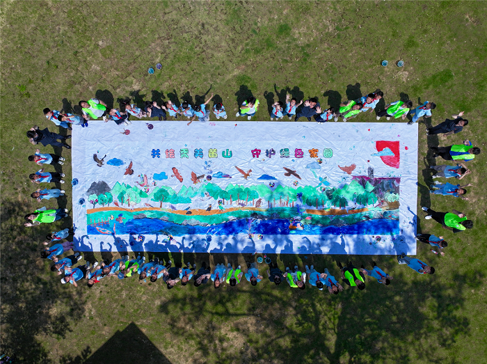 生命与环境科学学院飞羽鸟类保护协会成员便成为现场焦点。在“黄山鸟类”巨幅涂色环节,协会成员化身生态导师,耐心指导新潭小学的小朋友们辨识黄山珍禽--寿带鸟的飘逸尾羽、红嘴相思鸟的灵动身姿、白鹇的典雅华彩。孩子们在专业引导下,以童心为墨,为素白画布上的珍禽赋予斑斓生命,共同绘就了象征守护承诺的《新安飞羽守护图》。油彩流淌间,生物多样性保护的种子悄然播撒。