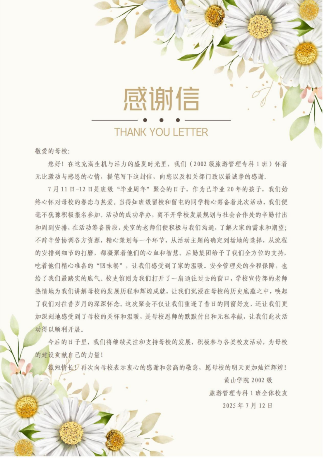 近日,我校2002级旅游管理专科一班校友向母校发来感谢信,深情回顾了母校的培养之恩,并对学校在毕业“二十周年”返校活动中的精心安排表示衷心感谢。校友们在信中表示,未来将一如既往地关注和支持母校发展,积极参与校友活动,为母校建设贡献力量。
