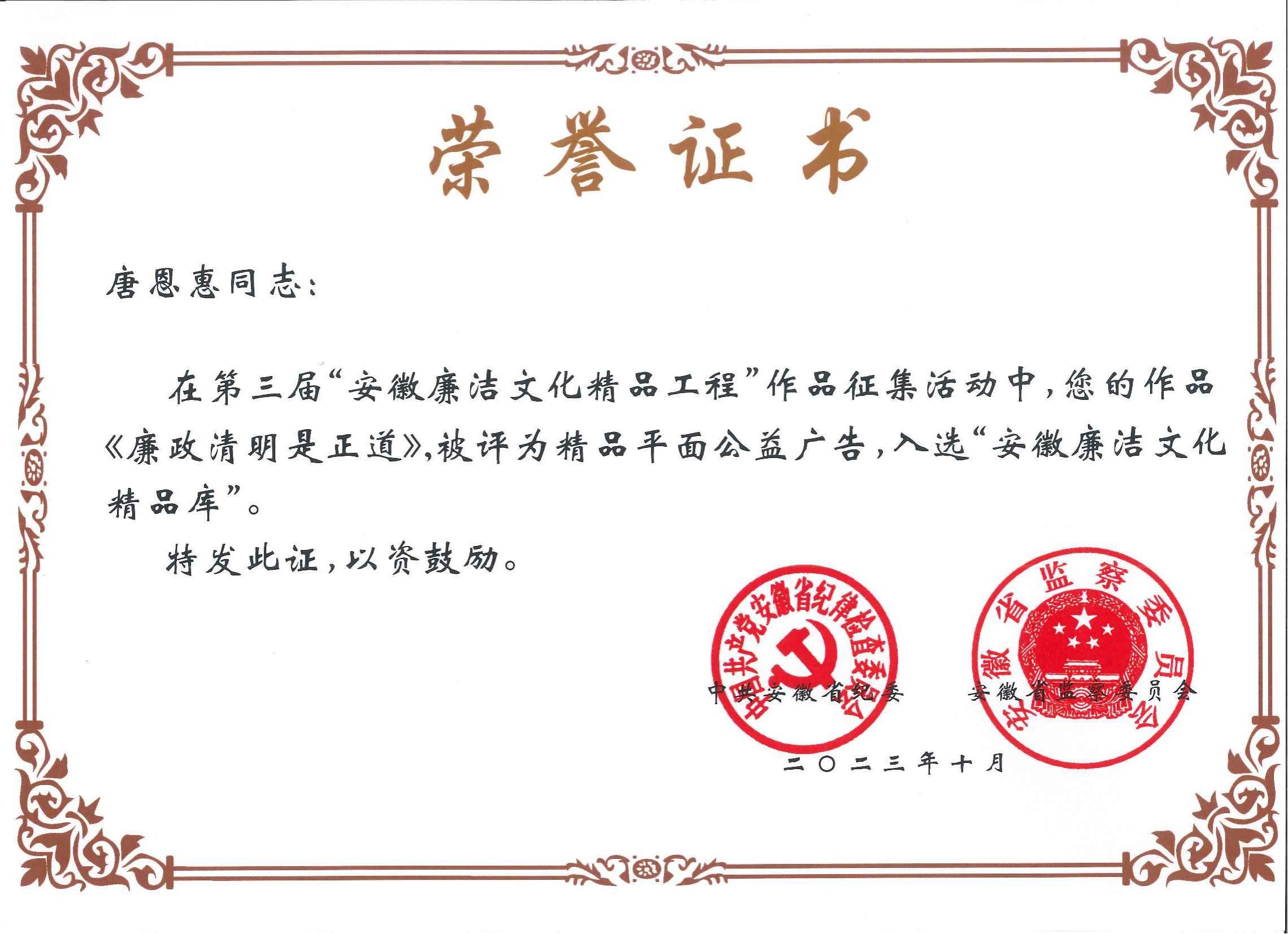 坚持严管与厚爱结合,将纪律监督融入日常、抓在经常。该支部创新设立学风促进、网络监督、班级辅导、宿舍文明、校园代言“五个”先锋示范岗,把监督触角延伸至课堂、网络与生活场景,形成“自我监督+同伴监督”双回路;通过观看廉政教育片、打造“清风徽韵”廉洁党课等方式引导党员在学思践悟中增强规矩意识、筑牢思想根基。该支部将纪律教育与艺术创作巧妙结合,把徽州元素转化为廉洁主题的视觉语言与作品表达,1名学生党员作品入选第三届“安徽廉洁文化精品工程”作品征集活动。