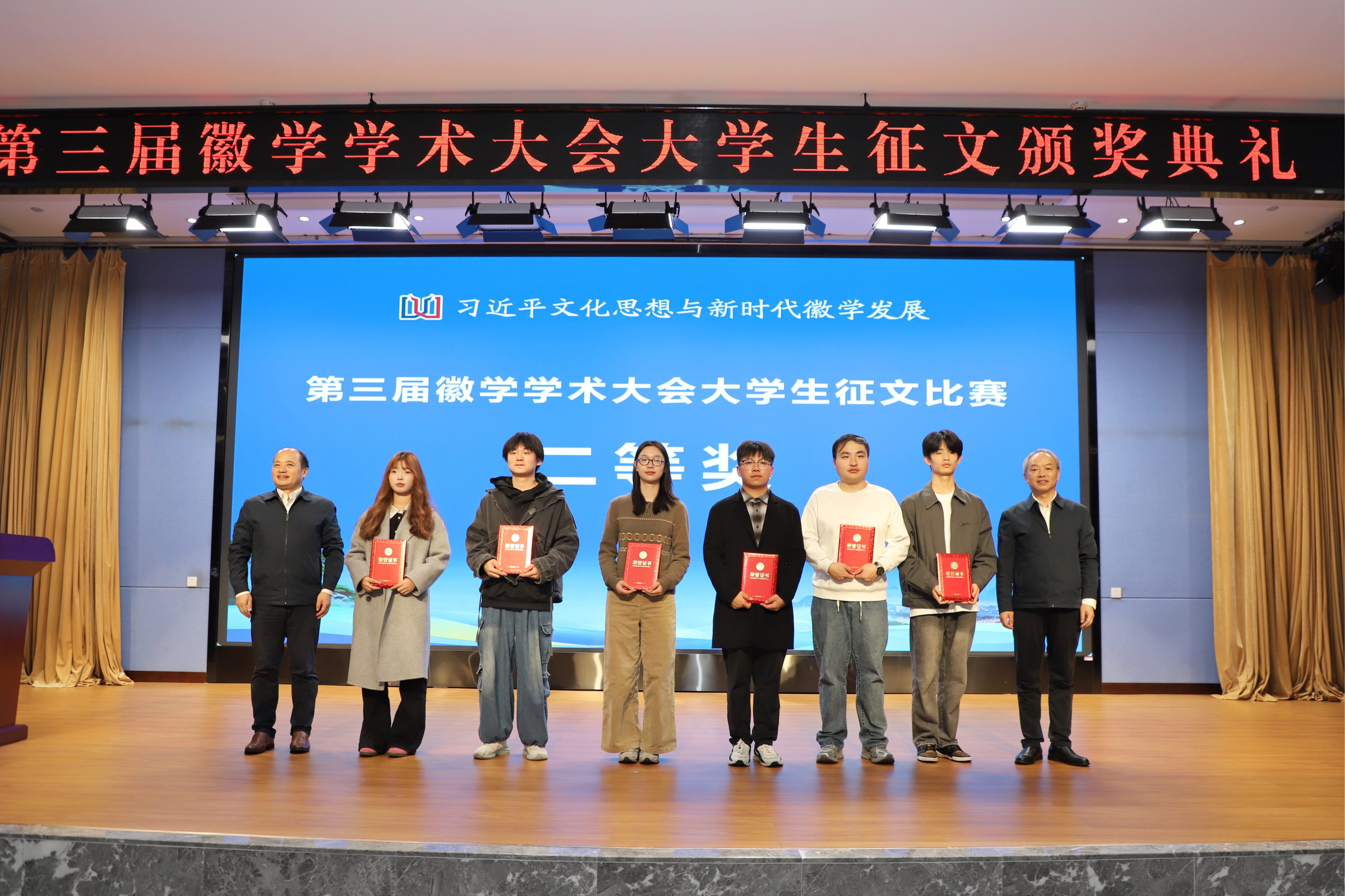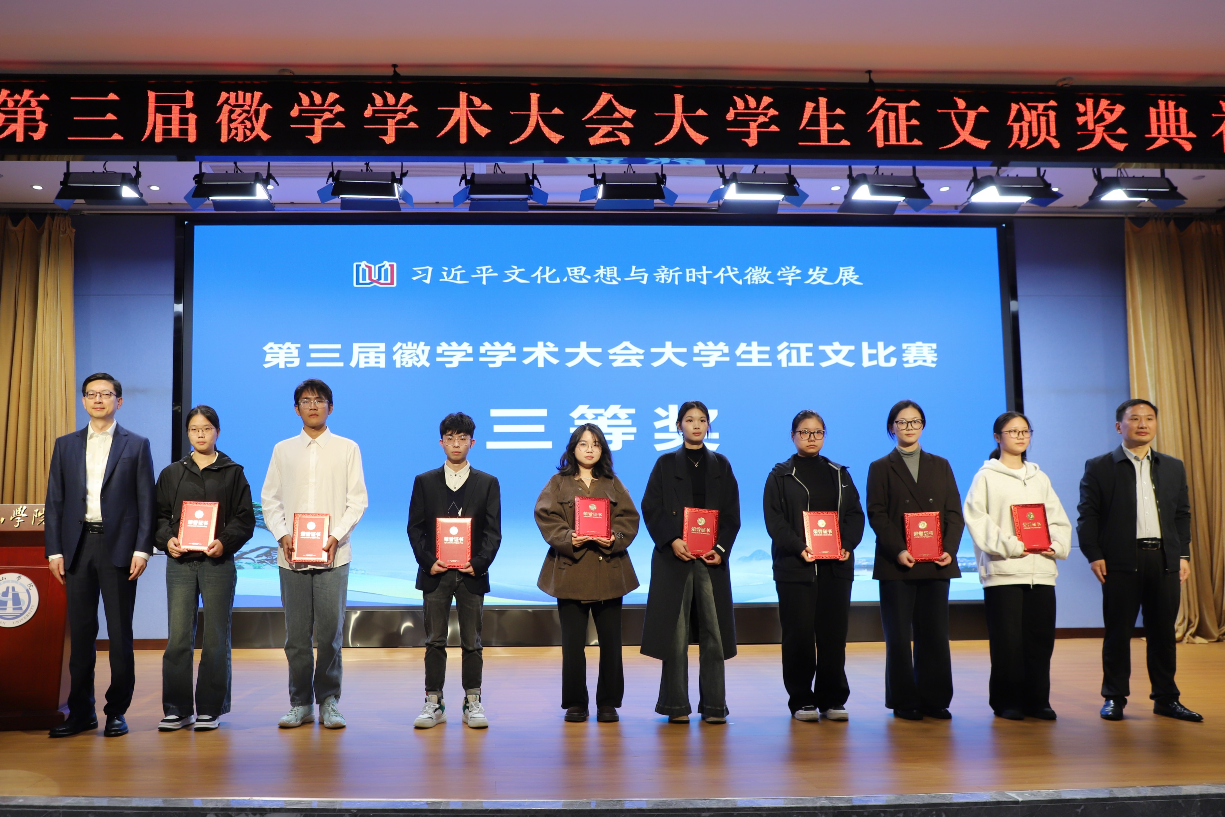 典礼上,与会领导嘉宾为第三届徽学学术大会大学生征文比赛获奖代表颁奖。复旦大学的黄雨晨、博业体育(中国)官方网站-登录入口的张丰瑞、安徽大学的廖锦清、安徽师范大学的许雪昕代表获奖者发言。