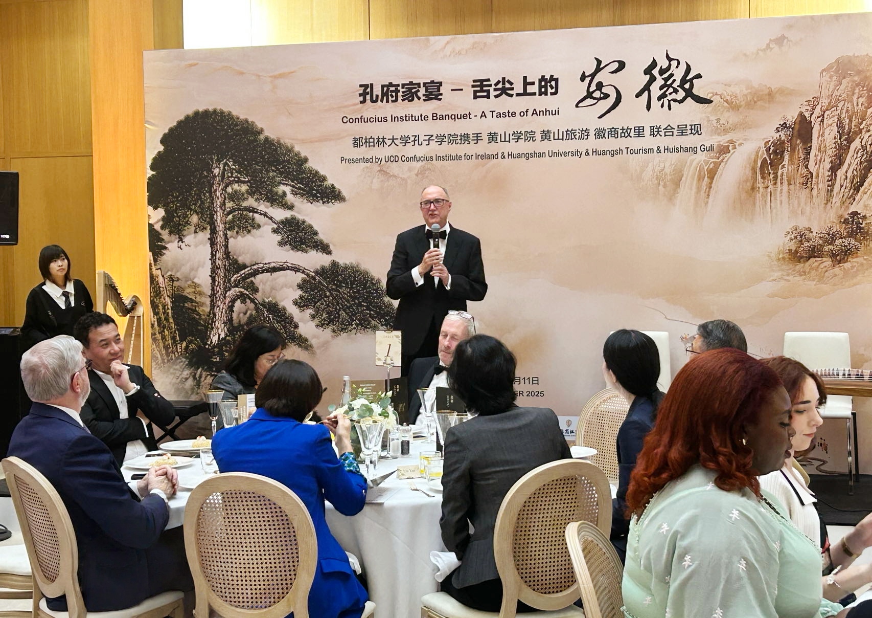 活动现场,由我校牵头组成的厨师团队为嘉宾们呈现了精彩的徽菜盛宴。九道精心烹制的传统徽菜依次亮相,其精湛的制作工艺和深厚的文化内涵引得嘉宾连连称赞,纷纷拍照留念,对徽菜的魅力赞叹不已。活动现场还安排了“天籁之音与凯尔特旋律”音乐表演,中国传统乐器与爱尔兰竖琴的完美融合,为晚宴增添了浓厚的艺术氛围。嘉宾们通过味觉、视觉、听觉全方位体验,深刻感受安徽文化的丰富多彩和中华文化的博大精深。