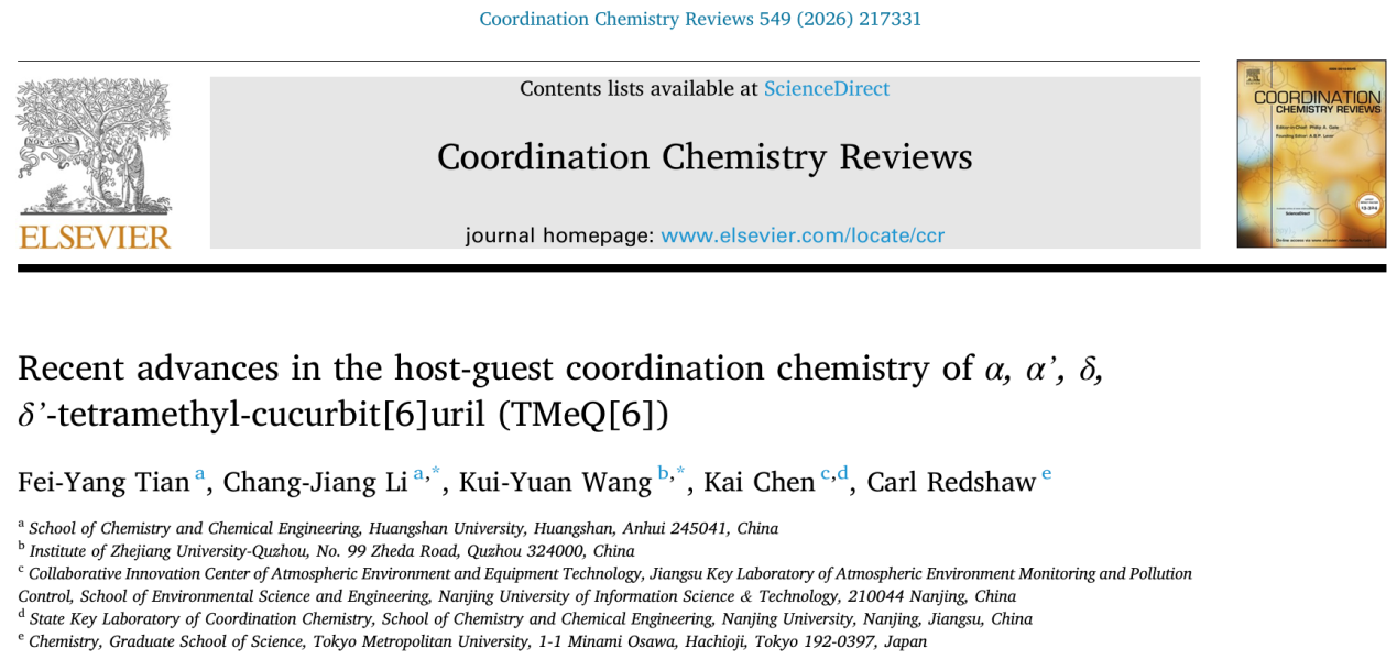 近日,我校化学化工学院田飞扬博士与浙江大学衢州研究院王魁元副研究员、东京都立大学Carl Redshaw教授等合作,在配位化学领域国际权威综述期刊《Coordination Chemistry Reviews》上发表题为“Recent advances in the host-guest coordination chemistry of α, α’, δ, δ’-tetramethyl-cucurbit[6]uril (TMeQ[6]) ”(α, α’, δ, δ’-对称四甲基六元瓜环(TMeQ[6])基主客体配位化学最新研究进展)的论文。论文链接:https://doi.org/10.1016/j.ccr.2025.217331。论文第一单位为博业体育(中国)官方网站-登录入口,该论文得到博业体育(中国)官方网站-登录入口高层次人才启动基金(2024xkjq022)、安徽省青年教师培养项目(DTR2023046)等资助。