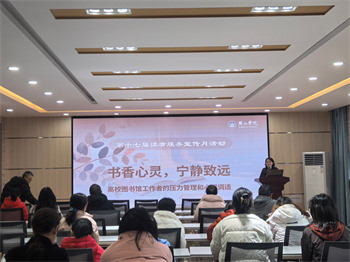 为关爱馆员身心健康,提升职业幸福感与团队凝聚力,11月27日上午,“书香心灵,宁静致远”——高校图书馆工作者压力管理和心理调适讲座在外国语学院三楼报告厅成功举行。本次讲座特邀教育科学学院叶文玲老师主讲,叶老师以专业的心理学视角,层层剖析了压力产生的深层来源,引导大家正视并科学认识工作与生活中常见的情绪负荷。在互动交流环节,图书馆钟小艾老师结合自身实际,提出了关于教育平衡与情绪应对的困惑。叶老师并未直接给出“标准答案”,而是以“接纳当下”为核心,赋予了大家重新审视问题的新视角与思维框架。讲座尾声,叶老师带领全体人员进行引导式冥想,实现了短暂而深度的精神休整。本次讲座不仅是一堂实用的心理调适课,更是一次温暖的团队关怀,为构建和谐、高效、有温度的服务团队注入了“心”能量。