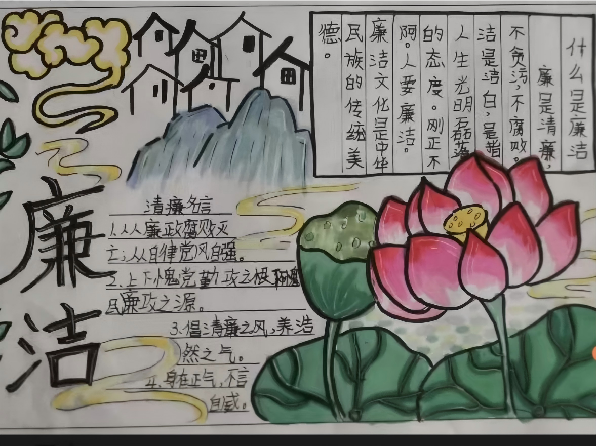 开展以廉洁文化为主题的创意活动,借助扇面这一传统艺术载体,创作蕴含廉洁寓意的书画作品,生动展示廉洁文化的魅力;并以宿舍为单位,创作廉洁主题的手抄报,在校园内广泛传播清廉之风、正义之气,将“清正廉洁、诚实守信、勤俭节约”等道德规范内化于心,外化于行。