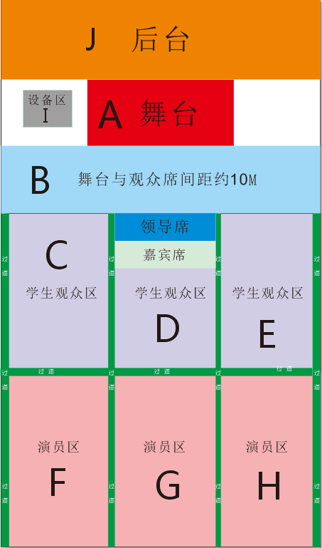 1.现场区域划分:嘉宾区为处级干部、二级党委(总支)委员、党支部书记、支部委员观众区;C区、D区、E区为学生观众区;F区、G区、H区为演员区,风雨操场副馆为演员候场区,谢绝婴幼儿入场。