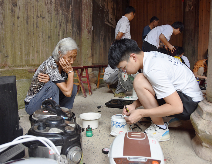 在歙县深渡镇九砂村,胡家俊一行看望了信息工程学院“暖心向阳”公益实践服务队的师生志愿者,现场观摩了志愿者为村民维修电风扇、电饭煲、电吹风、电茶壶等小家电,并与志愿者们现场进行了交流。详细询问了志愿者们的工作和生活情况,为同学们躬身实践、甘于奉献的精神点赞。他勉励志愿者要心怀感恩、乐于奉献,开拓进取、敢于担当,用自己的专业所长为乡亲们做好服务。