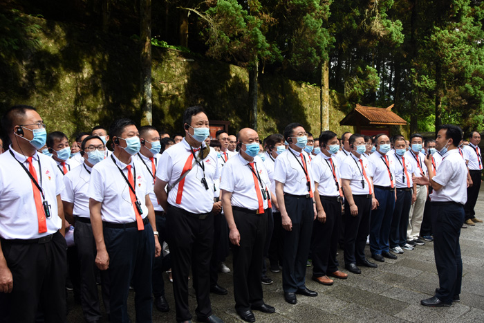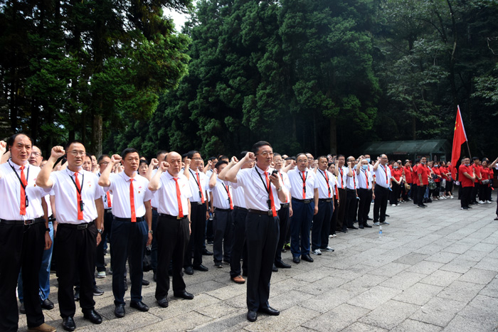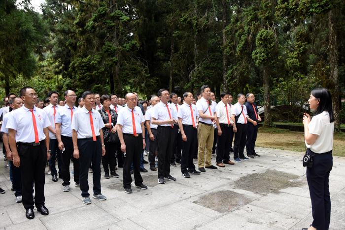 在井冈山革命烈士陵园,全体学员整齐列队,神情肃穆,缓步拾级而上,向长眠在这里的四万八千多名革命烈士敬献花圈,校党委书记汪枫同志整理花圈挽联,并集体默哀三分钟,表达发自内心的崇高敬意。随后,在汪枫同志的带领下,全体党员面向党旗重温入党誓词,铮铮誓词回荡在洒满无数先烈鲜血的井冈群山中。
