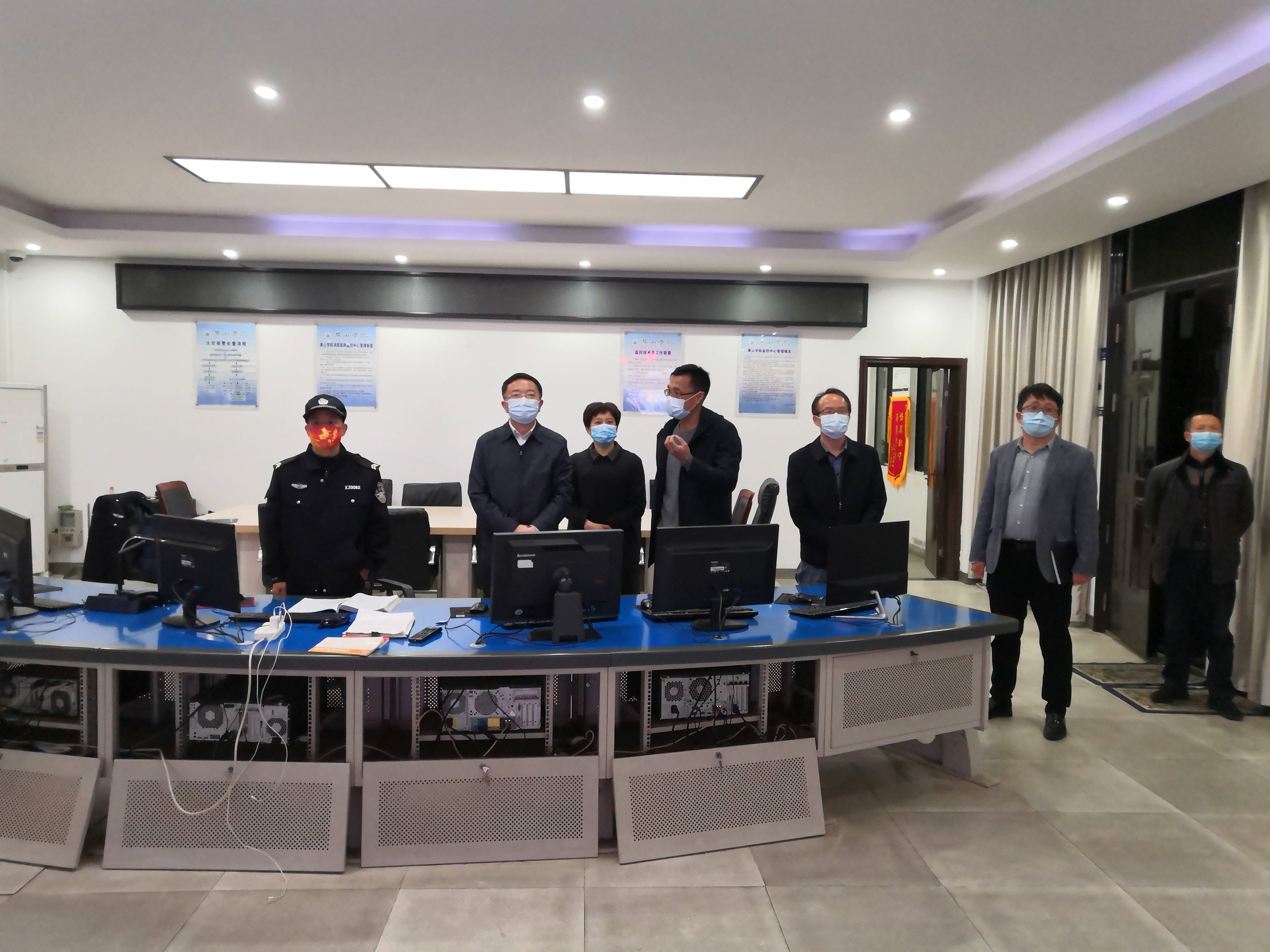 在应急指挥中心,汪枫一行查看了各个监控点位传输的视频信号,详细了解当前校门管控情况,特别是人员、车辆进出管控措施等。汪枫强调,当前疫情防控形势严峻,校门作为校园防疫的第一道防线,要牢固树立底线思维,切实做到“守住门、盯住人”,确保防控责任落实、落细;要加强校园内公共场所、重点部位的巡查力度,充分发挥技防在疫情防控工作中的重要作用,将校园安全关口深推前移,助力校园疫情防控精准高效。