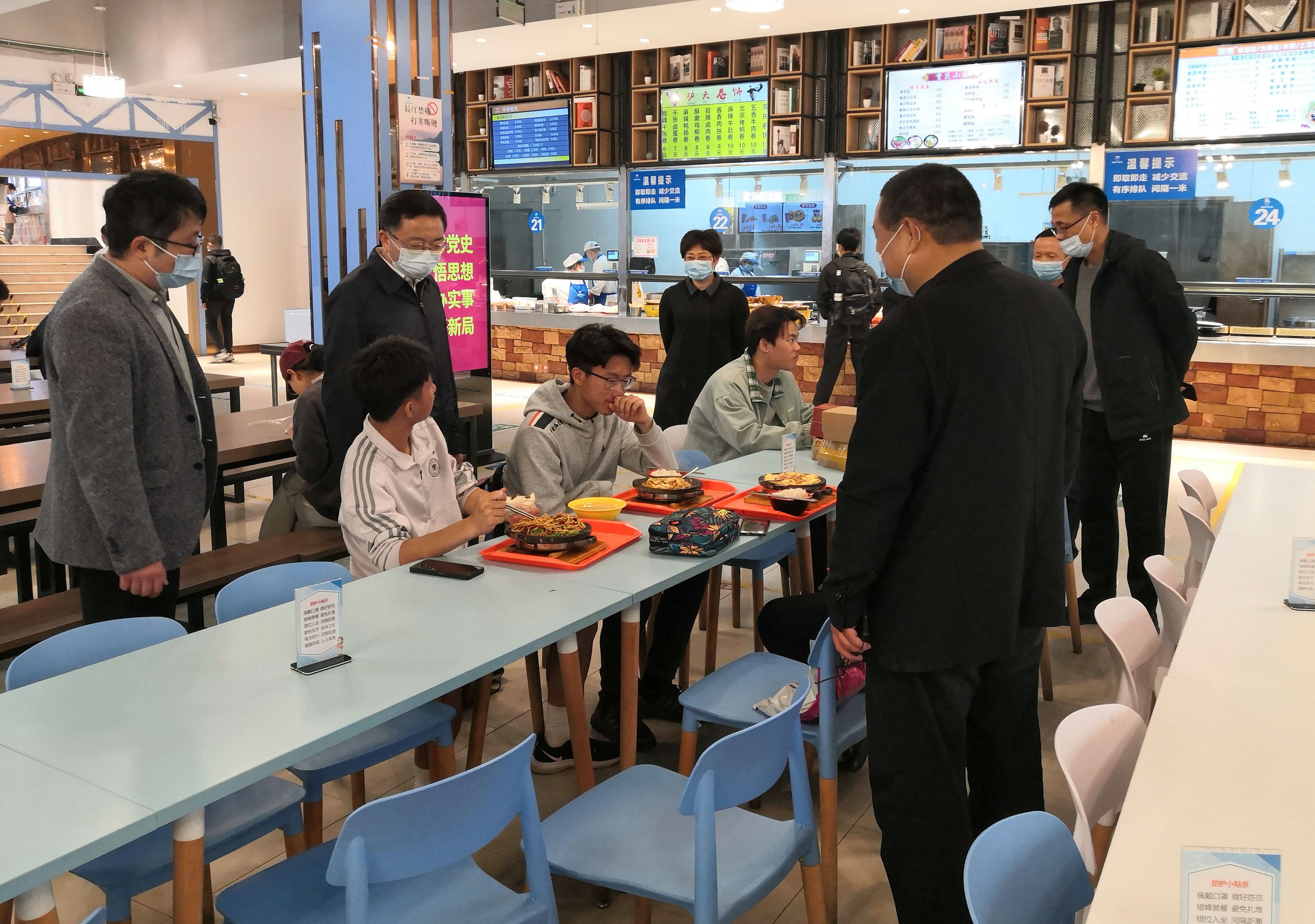 在率水校区第二食堂,汪枫一行来到供应窗口前,仔细察看饭菜品种和质量,详细了解各类菜品供应、在岗人员情况、每日就餐情况,要求餐饮企业严格落实疫情防控政策,切实加强食堂采购、加工、就餐管理,落实从业人员的健康检查,确保学生就餐环境以及食品安全。正值用餐时间,汪枫上前和同学们亲切交流,询问同学们对食堂餐饮的意见建议,叮嘱同学们要科学饮食、健康饮食,响应国家号召,厉行节约、避免浪费。汪枫要求有关部门收集了解学生用餐需求,倾听学生心声,切实保障和满足学生实际需求。