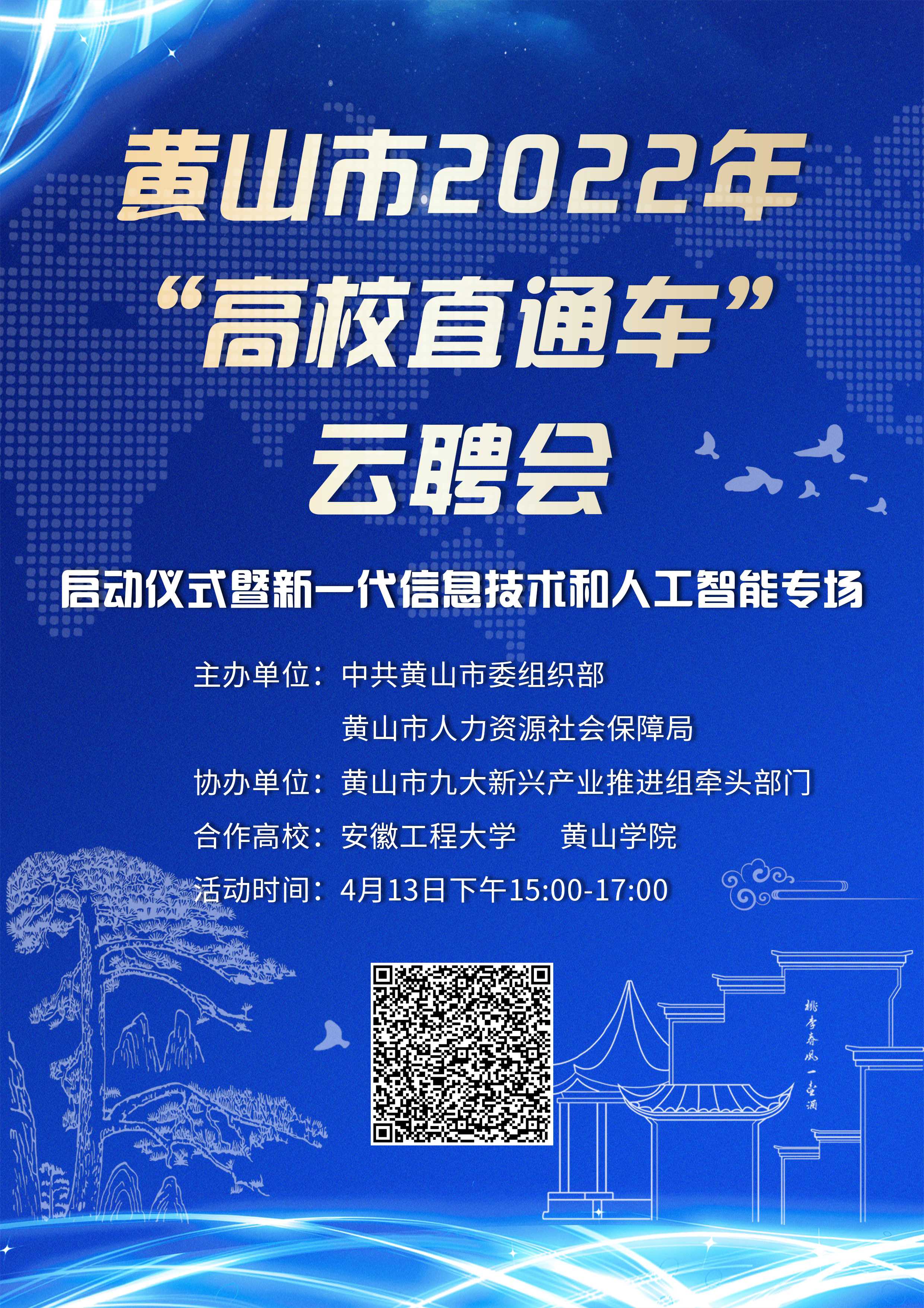 为深入贯彻落实安徽省就业工作座谈会暨省就业工作领导小组全体会议等会议精神,确保“百万大学生兴皖”行动在我市迅速实施,同时,切实做好疫情防控常态化下我校毕业生就业工作,引导毕业生留黄就业,服务地方经济社会发展,根据《关于开展促进高校毕业生本地就业专项行动的通知》要求,4月13日下午15:00~17:00,我校与黄山市人社局等联合举办:黄山市2022年“高校直通车”云聘会新一代信息技术和人工智能专场,详细信息以及参加流程见附件1。