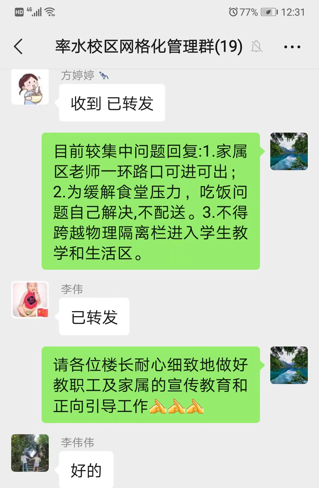 “有事找楼长!”“楼长,有你在,我们安心!”为应对校内教职工住宅小区疫情防控工作点多、面广、量大的现实困难,我校党委发出楼长“召集令”,聚焦“最小”作战单元,着力构建“网格长+楼长”的群防群治防控体系。让志愿楼长成为小区战“疫”主心骨,凝聚同心战“疫”的强大合力。