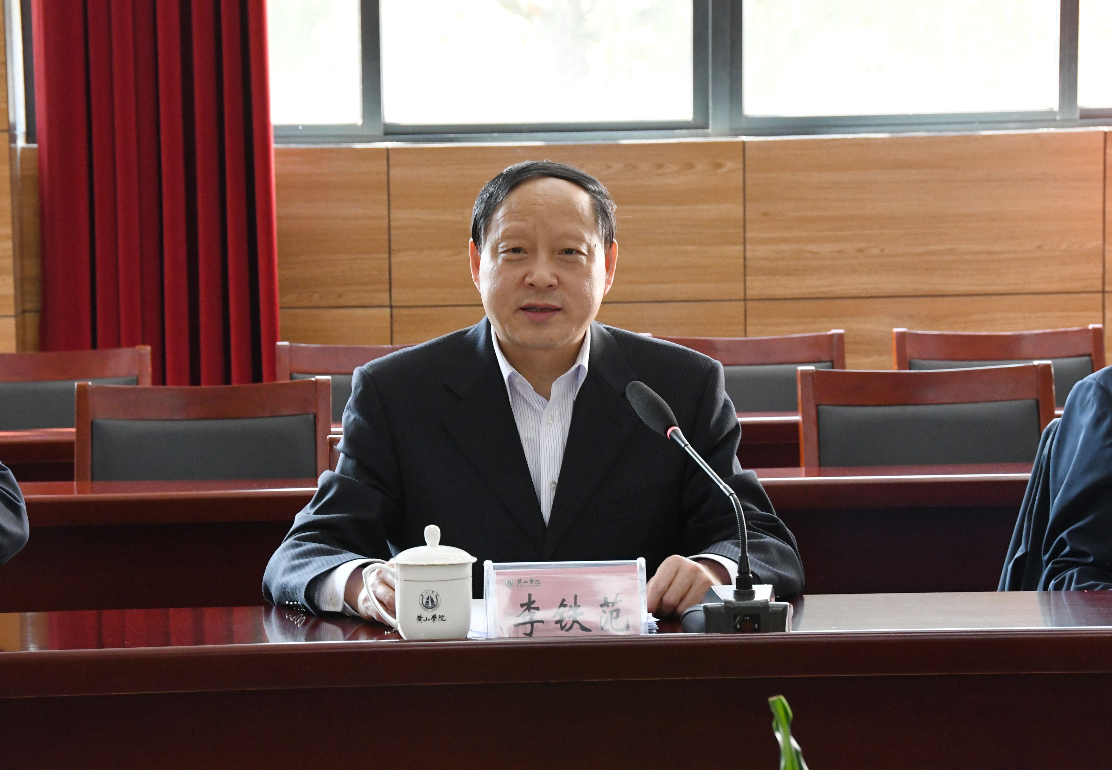 李铁范代表学校对周洪宇一行的到来表示欢迎,他介绍了我校的办学基本情况以及在学陶师陶研陶践陶方面所开展的主要工作。他表示,多年来,学校秉承陶行知先生“千教万教教人求真,千学万学学做真人”的矢志追求,着力在立德树人上下功夫。以“教人求真,学做真人”为校训精神,力求将行知先生一生“求真”的炽热追求融入广大师生的精神和血脉之中。多年来,学校秉承行知先生“生活即教育,社会即学校,教学做合一”的教育思想,着力在应用型人才培养上下功夫。始终扎根徽州大地办大学,坚持“知行合一”,既重专业知识学习,更重技能培养。秉承行知先生“捧着一颗心来,不带半根草去”的坚定信念,着力在锻造优秀师资队伍上下功夫。以行知先生为楷模,表彰30年教龄教师,引导教师做“四有”好老师。秉承行知先生“敢探未发明的新理,敢入未开化的边疆”的创造精神,着力在创意创新教育上下功夫。以“创意创新”为价值导向,构建创意创新教育体系,学校被列为安徽省首批国家级大学生创新创业实施高校、安徽省普通高校大学生创新创业教育示范校。秉承行知先生“爱满天下”的师者风范,着力在培育时代新人上下功夫。坚持课内课外联动,校内校外结合,努力践行社会主义核心价值观。