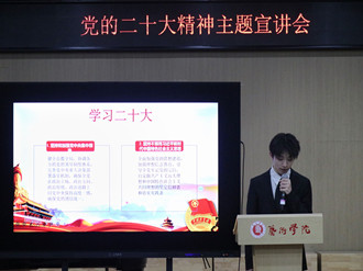 在音乐厅,艺术学院宣讲团成员李上琪以《用新的伟大奋斗创造新的伟业》为主题,以习近平总书记在党的二十大报告中对青年的寄语为切入点,结合自身志愿服务经历,号召广大同学扎实学好理论知识,积极投身实践锻炼,把青春奋斗融入党和人民的伟大事业当中,争做有理想、敢担当、能吃苦、肯奋斗的新时代好青年。在数学与统计学院,宣讲员夏杨心月以《增进民生福祉,提高人民生活品质》为题,深入浅出的讲述了中国式现代化事业取得的历史性成就,发展中国式现代化的坚实物质基础和主动精神力量。