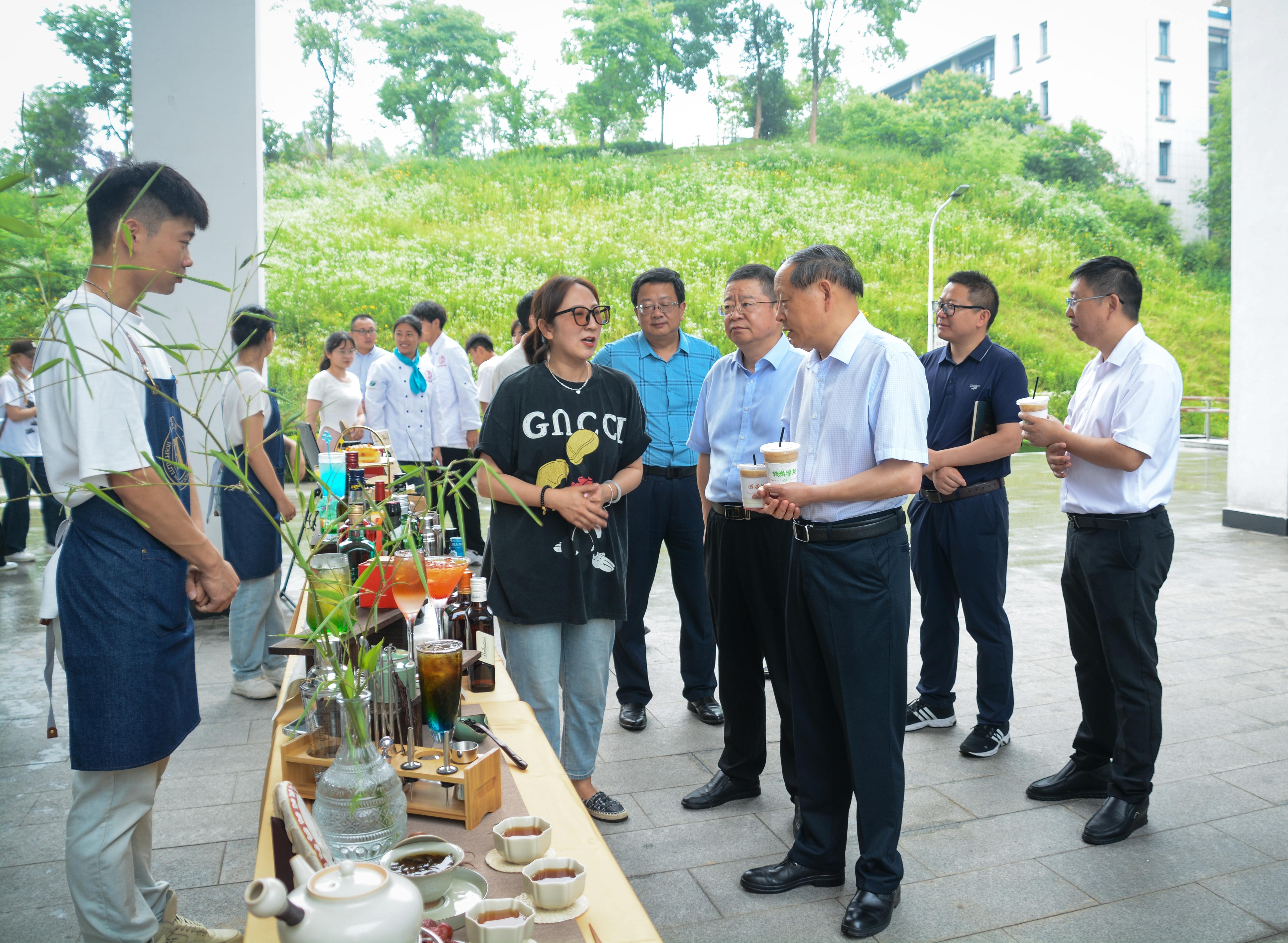 李铁范一行在旅游学院相关人员的引导下,参观并品尝了学生调制的咖啡、酒水、新中式茶饮等特色饮品,并同专业师生亲切交流,认真了解专业办学情况以及在办学中存在的问题;通过走访和调查,进一步深化对酒店管理专业的认识,深化对应用型专业办学的思考。李铁范充分肯定了酒店管理专业学生的学习成果,他表示,此次教学成果展彰显了酒店管理专业在实践课程教学改革中取得的成果,展示内容、形式让人耳目一新,展出作品精彩纷呈。他指出,近年来,旅游学院坚持“地方性、应用型、国际化”办学定位,始终坚定不移走高质量发展道路,深化产教融合、校企合作,坚持开放办学,形成了一批具有示范引领作用、符合产业发展需求的优质成果,培养出一批适应旅游经济发展需求的高素质应用型人才。希望全体师生以开展学习贯彻习近平新时代中国特色社会主义思想主题教育为契机,按照“学思想 强党性 重实践 建新功”的总要求,积极推进教育教学改革,探索应用型大学高质量发展新路径,努力实现学生高质量充分就业。