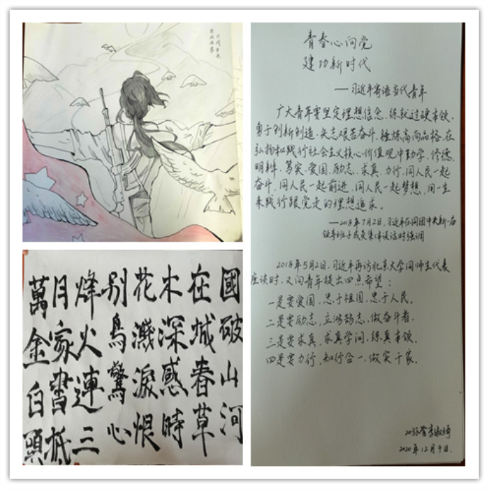 此次比赛主题为“青春心向党·建功新时代”,分为绘画类、软笔类和硬笔类三种类型。经过层层筛选,经前期宣传,吸引了大一各班级众多的书法、绘画爱好者报名参加。经评选,共计16名同学进入当天的决赛。决赛现场,选手们各展其才,字里行间,典雅秀逸的水墨之间,无一不展现了他们扎实的绘画与书法功底。最终,李淑琦和张晶晶同学分别获得了书法组硬笔类和软笔类一等奖,朱济雨同学获得了绘画类一等奖。龚政、余莹滢等六位同学获得二等奖,方珍、陈文娟等六位同学获得三等奖。