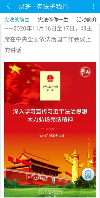 为弘扬宪法精神,建设法治校园。12月4日,易班发展中心举办为期一周的“国家宪法日——小易半月谈之宪法小课堂”宪法宣传周线上答题活动。