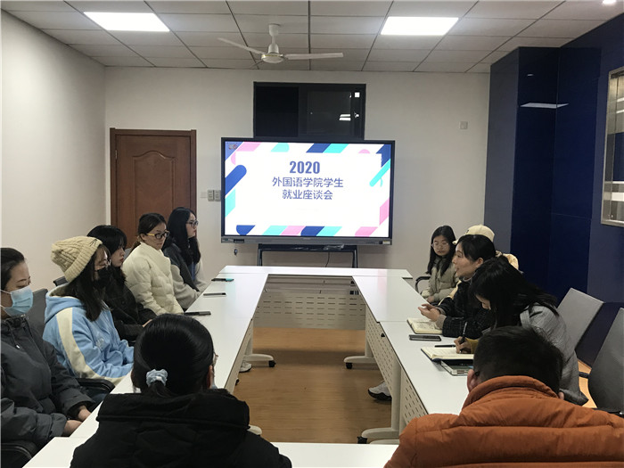 为推进就业工作,12月9日下午,外国语学院在逸夫楼综合楼5406会议室召开毕业生就业a工作座谈会,2017级英语、日语专业各班学生代表参会,会议由学院党委副书记张文静主持。
