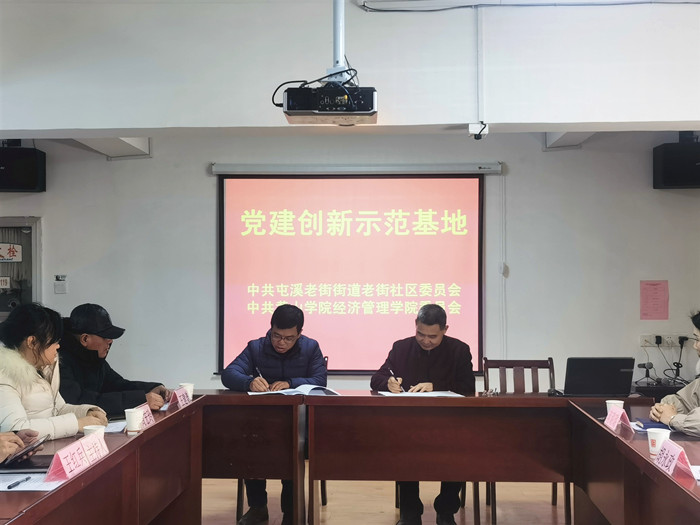 12月16日上午,经济管理学院党委书记胡永政、党委委员江红、学生党支部书记蒋璐璐一行赴屯溪区老街街道老街社区推进党建创新共建和打造老街社区社会实践育人基地事宜。老街街道党工委副书记、人大工委副主任,老街街道党工委委员、办事处副主任以及老街社区部分党务工作者参加共建签约暨老街社区社会实践育人基地揭牌仪式。