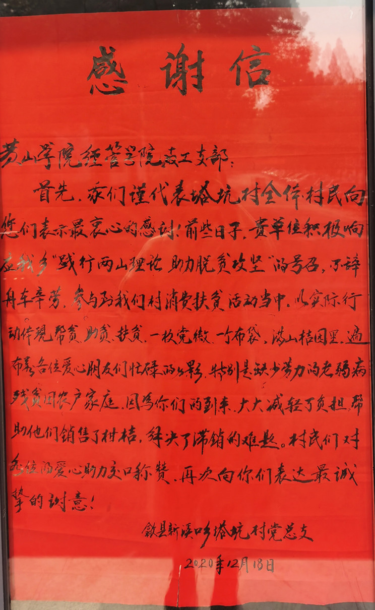 感谢信称,经济管理学院教工党支部积极响应中央国务院和省委省政府“践行两山理论、助力脱贫攻坚”的号召,积极深入塔坑村贫困户家庭采摘柑橘助力扶贫活动,以实际行动帮贫、扶贫、助贫,缓解了贫困户家庭柑橘滞销压力,助力贫困户家庭增收脱贫,为今年塔坑村决胜脱贫攻坚作出了贡献。塔坑村村民对经济管理学院教工党支部组织扶贫善行交口称赞,深表谢意。