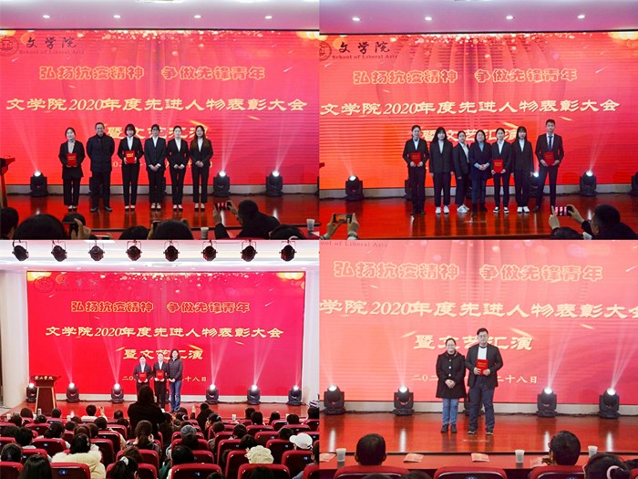 12月28日晚,文学院2020年度先进人物表彰大会暨文艺汇演在文端楼二楼报告厅举行。该院领导班子、教师代表、全体专职辅导员及学生代表共300余人参加了此次活动。