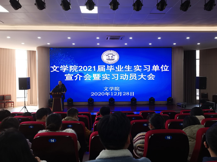 12月28日下午,文学院在文端楼二楼报告厅举办2021届毕业生实习动员暨实习单位宣介会。该院党政领导班子成员、毕业班辅导员,各招聘单位代表及2021届全体预毕业生参加了此次会议,该院副院长沈昌明做实习动员讲话。