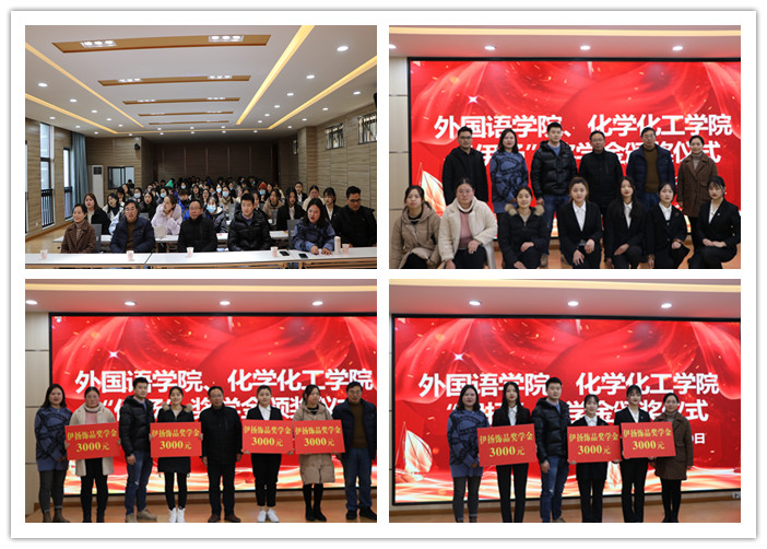 12月30日下午,外国语学院联合化学化工学院在逸夫楼5306教室举办了“伊扬”奖学金颁奖仪式。伊扬饰品有限公司董事长刘杨、总经理王草地,化学化工学院党委书记程周旺,党委副书记、纪委书记叶双峰,外国语学院党委副书记、纪委书记张文静出席仪式。仪式由外国语学院团委副书记陈铭主持,百余名学生参与。