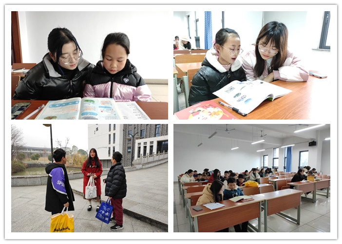 12月27日上午,外国语学院在逸夫综合楼5201教室举办本学期最后一期“向日葵”英语辅导站。22名英语专业志愿者对22名中、小学生进行一对一辅导。