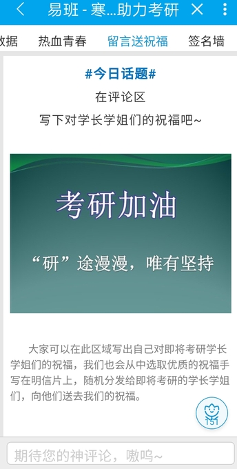 线下活动中,校易班工作站成员筛选出轻应用中的优质留言,手写在易班定制的明信片上,随机送给在校园内自习的考研学子。据悉,此次活动共收获评论留言320余条,轻应用页面浏览量近1900人次。