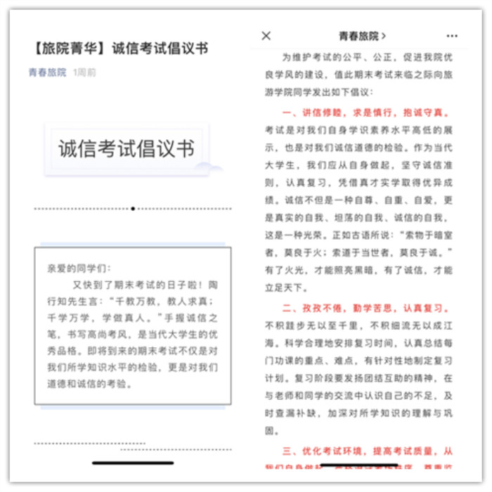 该院团委通过院网、微信公众号发出《诚信考试倡议书》,通过“理性认识,科学备考”“慎思明辨,防微杜渐”“遵守纪律,共创和谐”等三个方面告诉同学们认真对待考试、学会制定合理复习作息、抵制一切不正之风、遵守考场纪律和考试规则等。倡导同学们要拒绝作弊的陋习,树立诚信意识。
