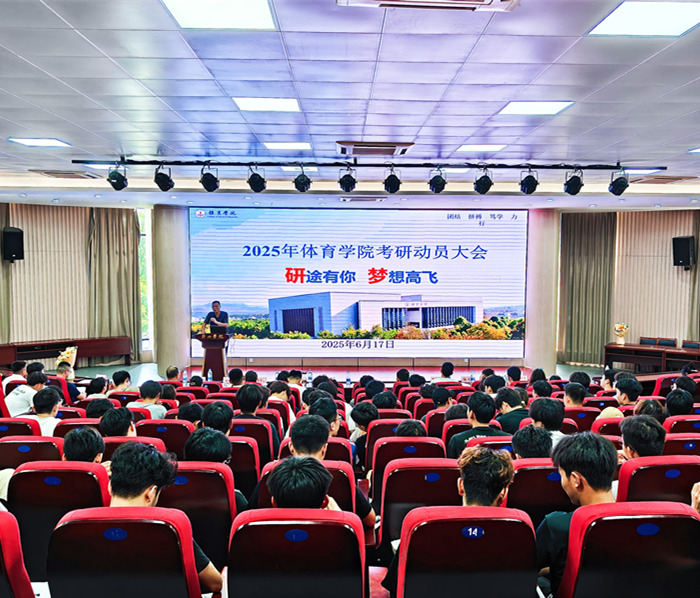6月17日下午,体育学院2025年考研动员大会在文端楼二楼报告厅举行。会议由体育学院党总支副书记张俊主持,领导班子成员、教研室主任、院团委、实训中心主任、专兼职辅导员及全体在校学生参加。