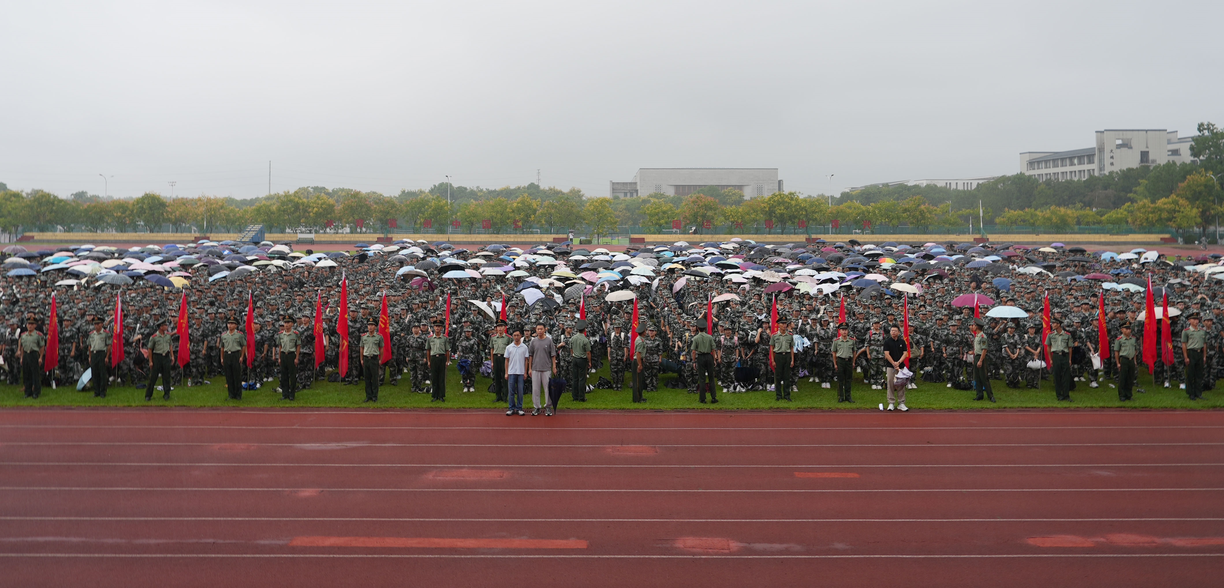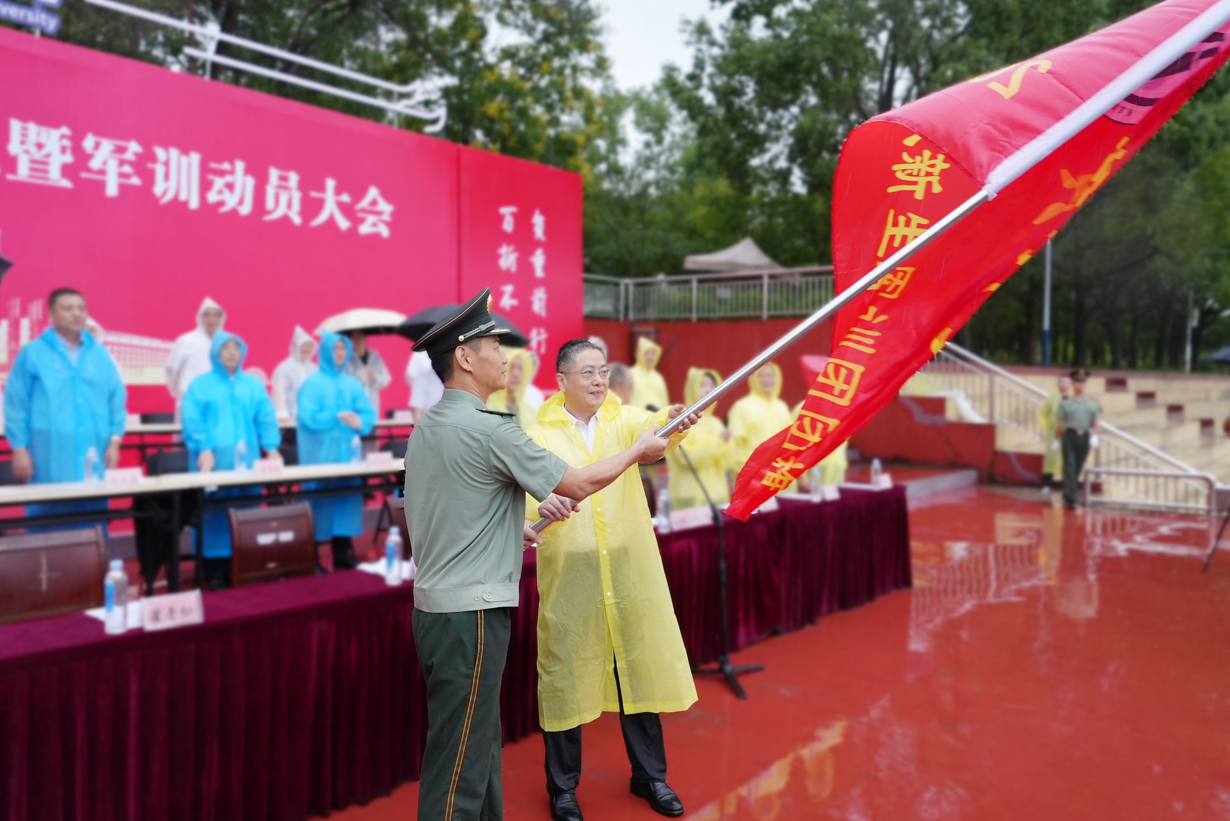 典礼上,校党委副书记、院长李庆宏向承训部队授军训团团旗。雨水浸润的旗帜愈加鲜红,仿佛昭示着新生们将在磨砺中绽放的青春底色。