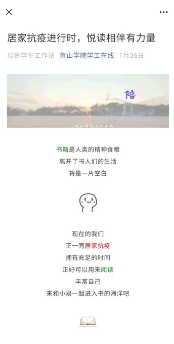 为了让我校学生在寒假期间合理进行自我规划、自我管理和自我提升,我校学生处积极谋划,多措并举,依托易班等平台优势,开展小易半月谈、居家抗疫、求职技巧学习等系列主题活动,积极进行网上思政教育,取得较好效果。