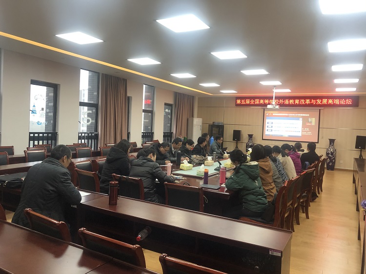 3月20日上午,第五届全国高等学校外语教育改革与发展高端论坛在北京及线上同步开幕。本届论坛主题为“铸教、铸人、铸魂”。外国语学院党政领导班子成员和各教研室教师代表在5402会议室聆听论坛主旨报告。
