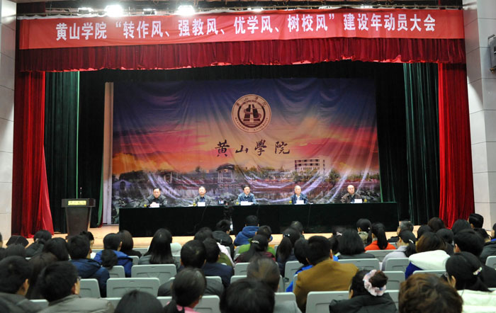 3月10日下午,我校在大学生活动中心会堂召开“转作风、强教风、优学风、树校风”建设年活动动员大会。党委书记汪枫,党委副书记、校长汪建利,党委副书记、纪委书记叶军,副校长胡家俊、胡善风出席会议。汪枫作动员讲话,汪建利主持会议,叶军解读活动方案。全体教职员工和200余名学生代表参加会议。
