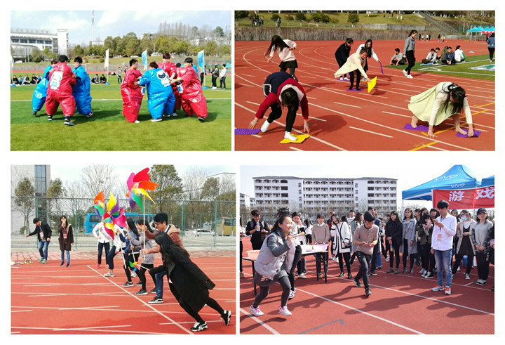 趣味运动会游戏项目丰富多彩,场地上分别设立ABC三个游戏活动区,另设一个中央最终游戏区,在各项游戏中获胜选手均可获得精美奖品。在游戏A区中,游戏“指压板跳绳”“仙人指路”备受欢迎,参赛选手六人一组,赤脚在指压板上进行三分钟跳大绳比赛,数量多者获胜。游戏B区中最受欢迎的游戏是“同舟共济”,四名同学同踩一块踏板进行速度上的比拼,比赛现场热闹非凡。游戏C区中为体育爱好者准备了多种多样的比赛项目,泡泡足球活动在足球的基础上增添了难度。趣味羽毛球赛与筷子夹乒乓球则为体育爱好者们提供了更多的选择。中央最终游戏区的相扑撕名牌活动,以社团为单位,各社团组成队伍进行撕名牌比拼,各社团为社团荣誉而战,竞争激烈也极富趣味性。