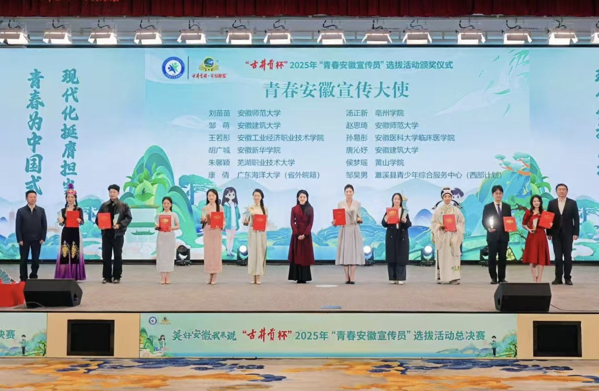 12月28至29日,“古井贡杯”2025年“青春安徽宣传员”选拔活动决赛在亳州举行。我校教育科学学院2023级学前教育(对口)专业侯梦瑶、艺术学院2024级音乐学专业许诺两名选手经过激烈角逐,分别荣获“青春安徽宣传大使”、“青春安徽宣传员”称号。