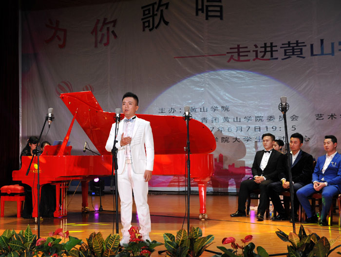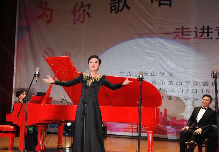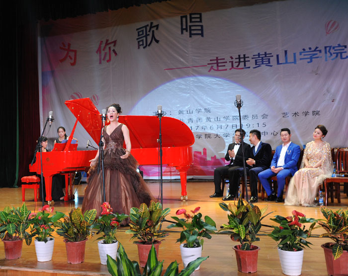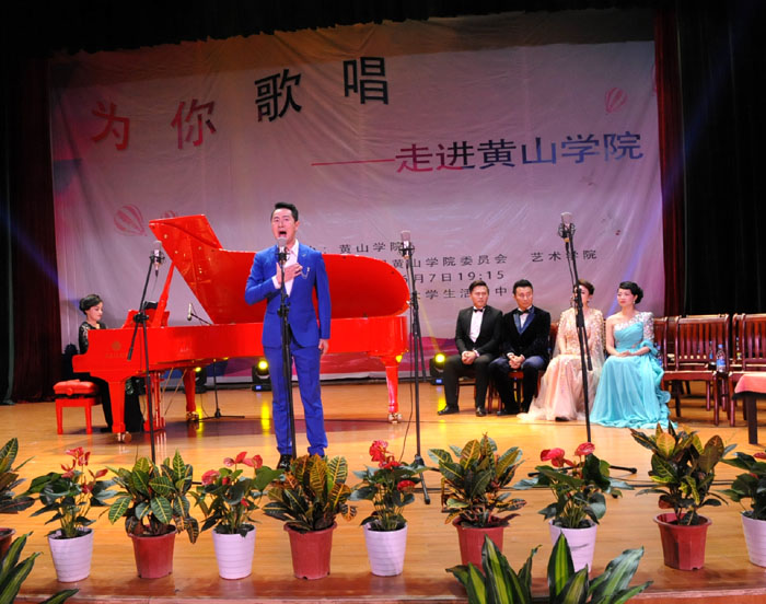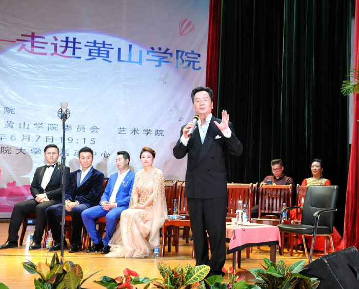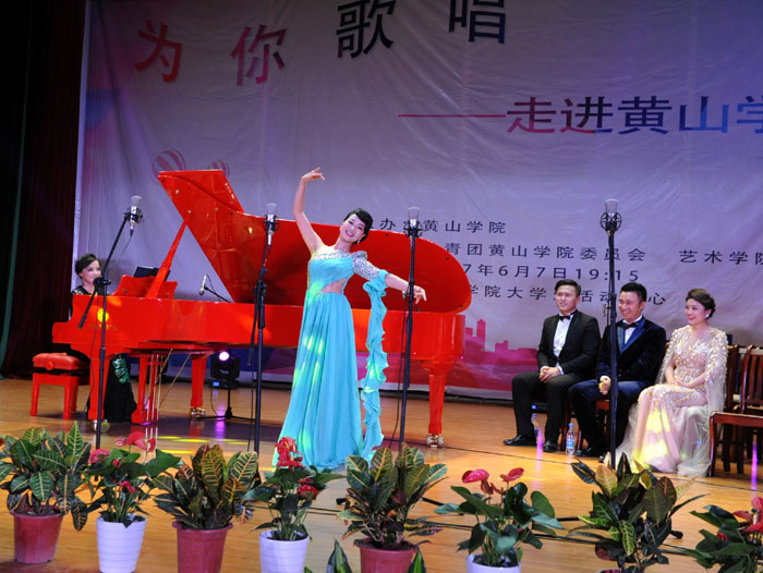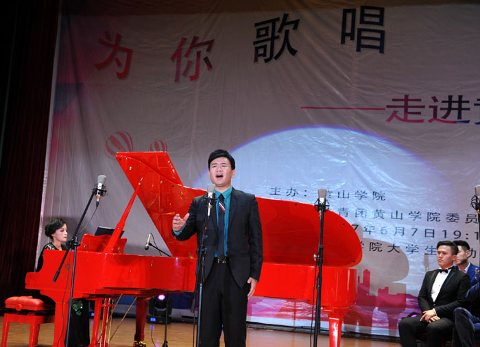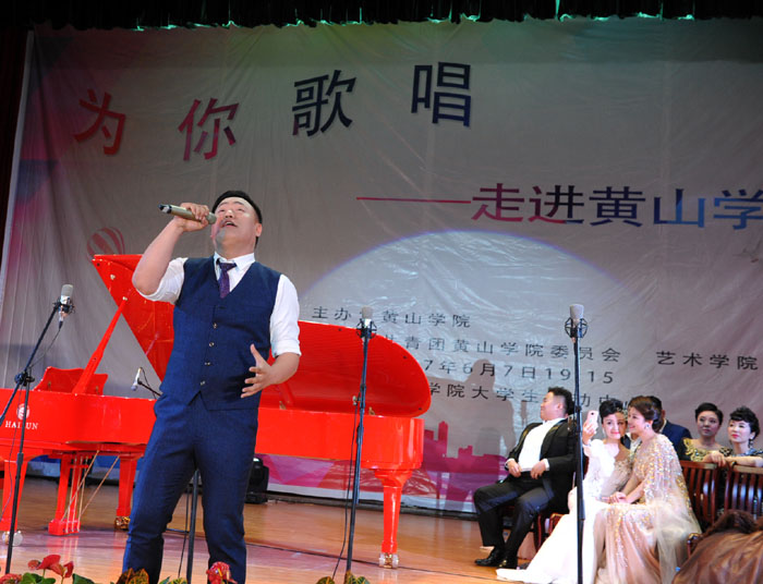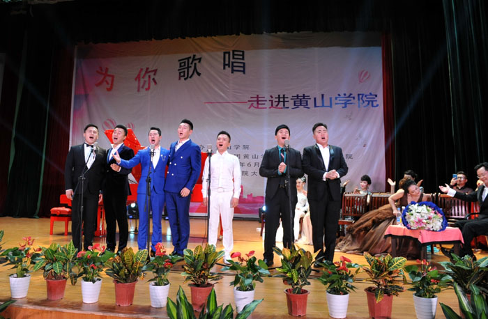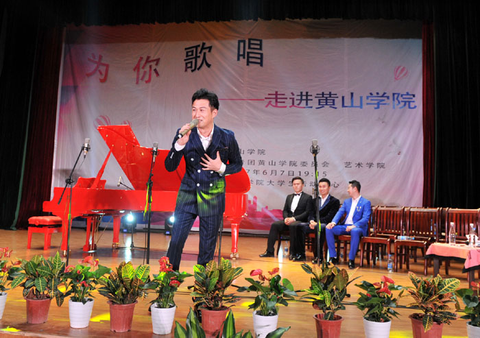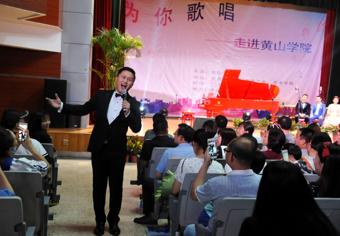 6月7日晚,我校大学生活动中心礼堂内灯光璀璨,座无虚席,“为你歌唱”音乐会在这里华丽上演。著名旅欧男高音歌唱家蔡大生带领来自全国各地的10余位青年歌唱家用饱满的激情、婉转的歌喉为我校师生奉献了一场精彩绝伦的音乐盛宴。校党委书记汪枫,校长汪建利,副校长胡家俊、胡善风、刘英旺,农行黄山分行和火箭军某部领导同我校师生共1000余人观看了音乐会。