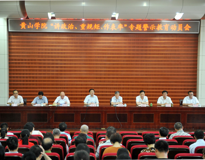 7月9日上午,学校在逸夫图书馆二楼报告厅召开“讲政治、重规矩、作表率”专题警示教育动员部署会议,传达学习全省“两学一做”学习教育常态化制度化暨“讲政治、重规矩、作表率”专题警示教育推进会精神,对我校专题警示教育进行动员部署。党委书记汪枫,党委副书记、校长汪建利,党委委员、副校长胡家俊,副校长胡善风,党委委员、副校长刘英旺,全校处级党员干部及党支部书记参加会议。汪枫作动员讲话,汪建利主持会议,胡家俊解读《实施方案》。